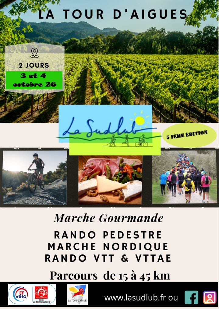 > » Une marche gourmande dans les vignes » : balade d’une dizaine de kilomètres située au cœur du vignoble du Luberon avec un départ de la place du château à La Tour d’Aigues. Vous dégusterez sur trois sites remarquables, un menu concocté pour vous par un chef local, accompagné par de vins et produits locaux.